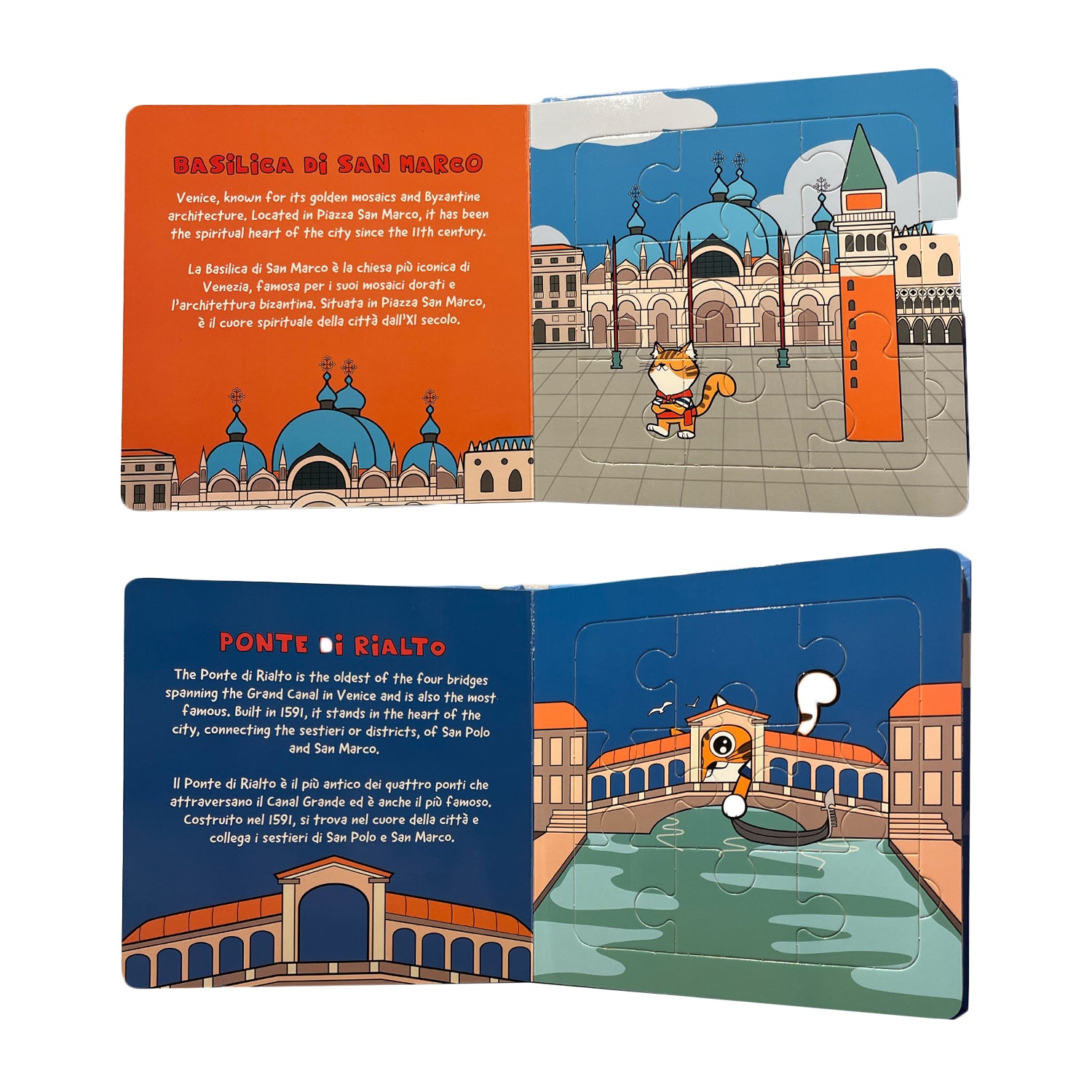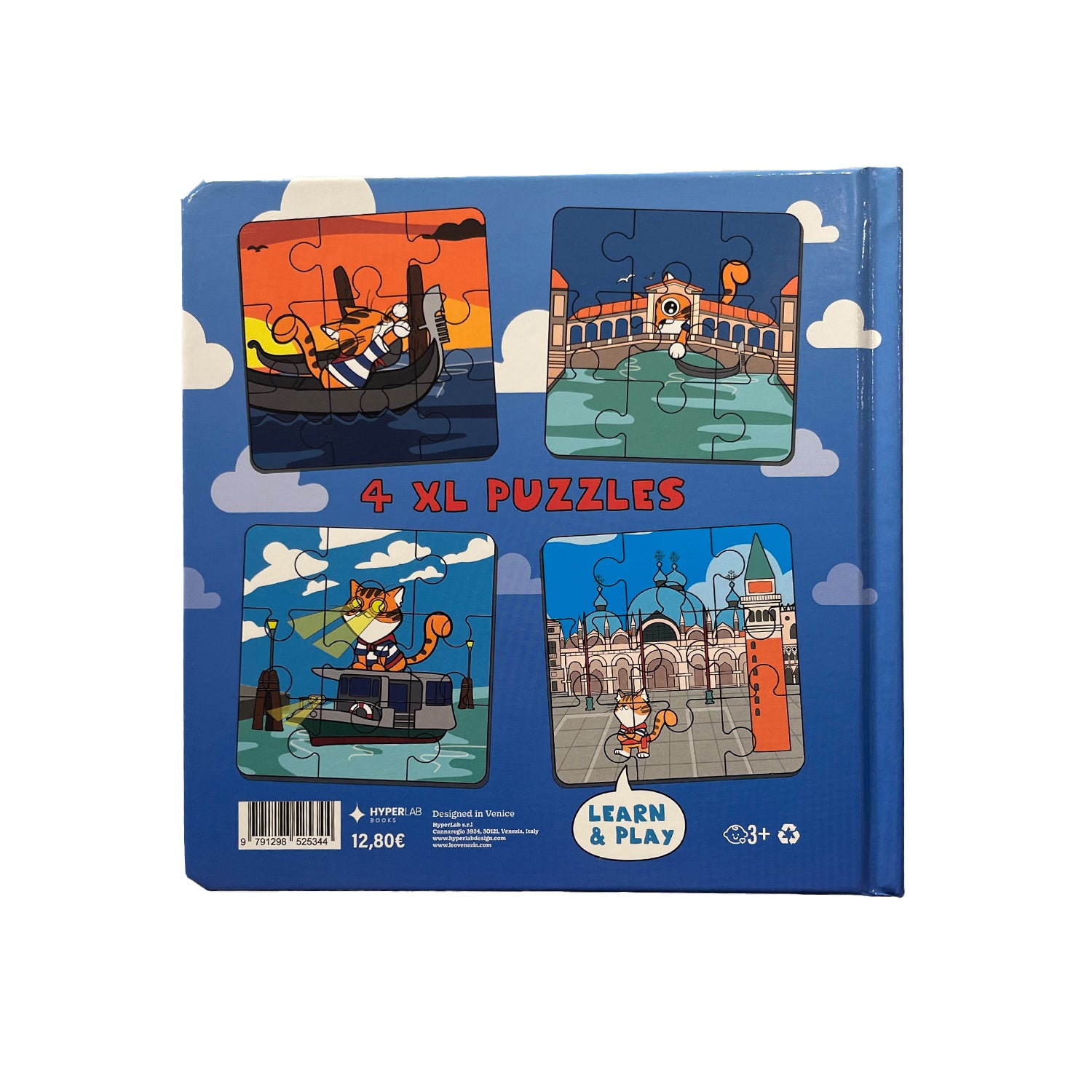 This puzzle book combines learning and play to spark children’s imagination, memory, and curiosity. Through fun and engaging activities, little ones follow Leo, the charming Venetian kitten, as he explores bridges, canals, and the magical scenes of Venice. The book includes 4 extra-large puzzles, each made of 9 pieces, specially designed for young children. Easy to handle and enjoyable to complete, the puzzles help develop observation skills, logical thinking, and hand–eye coordination while having fun.